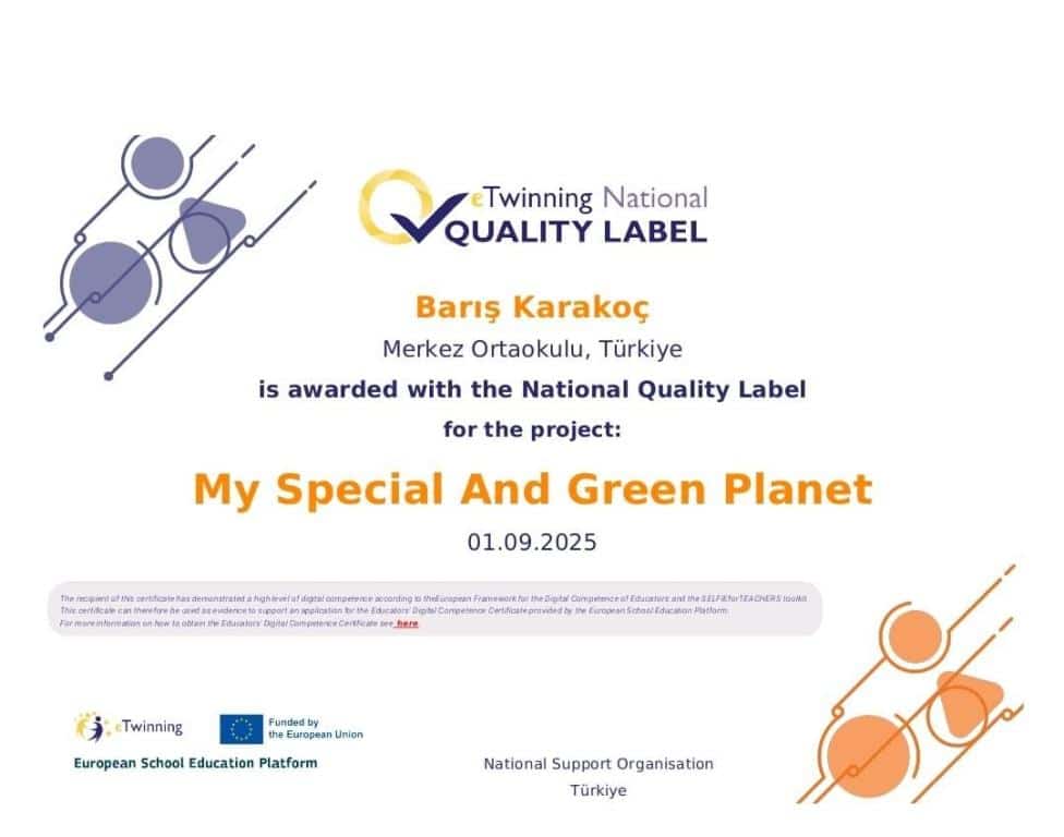 Okulumuz özel eğitim sınıfı öğretmeni Barış KARAKOÇ ve öğrencilerinin yürüttüğü “Benim Özel ve Yeşil Gezegenim” adlı eTwinning projesi, gösterdiği başarı ve katkılar nedeniyle Ulusal Kalite Etiketi Ödülüne layık görülmüştür.